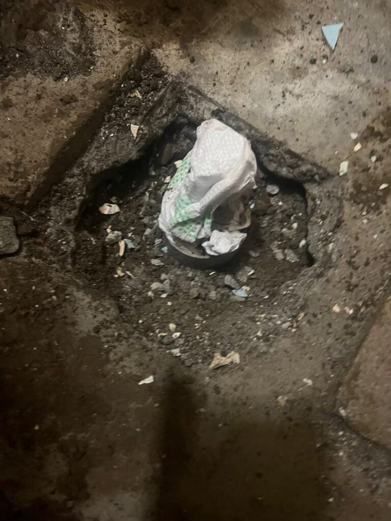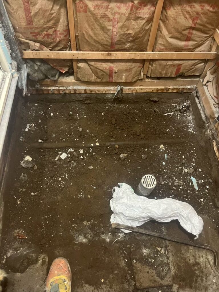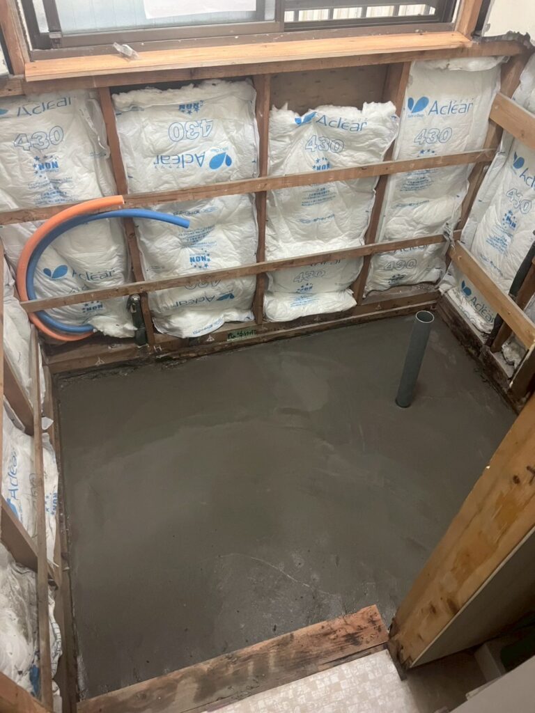 はつり解体後、給排水の配管を立ち上げ、床の土間打ちを行いました。