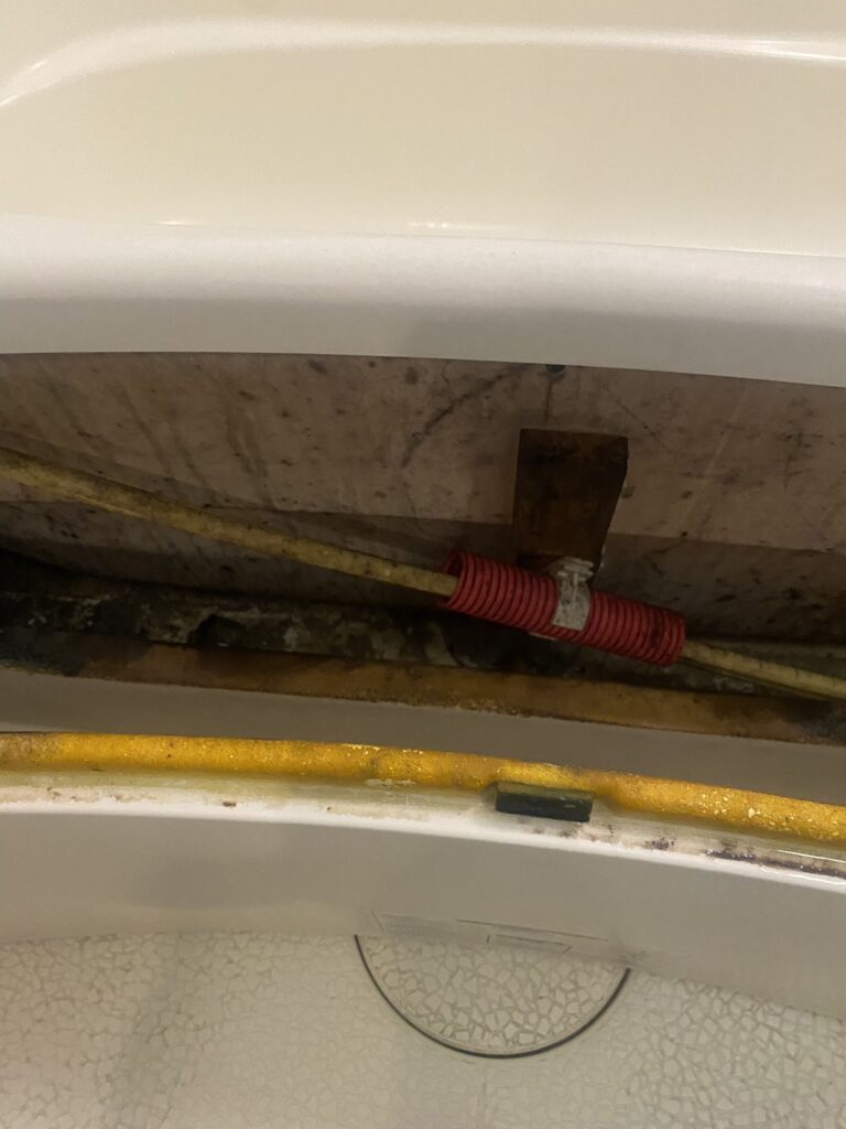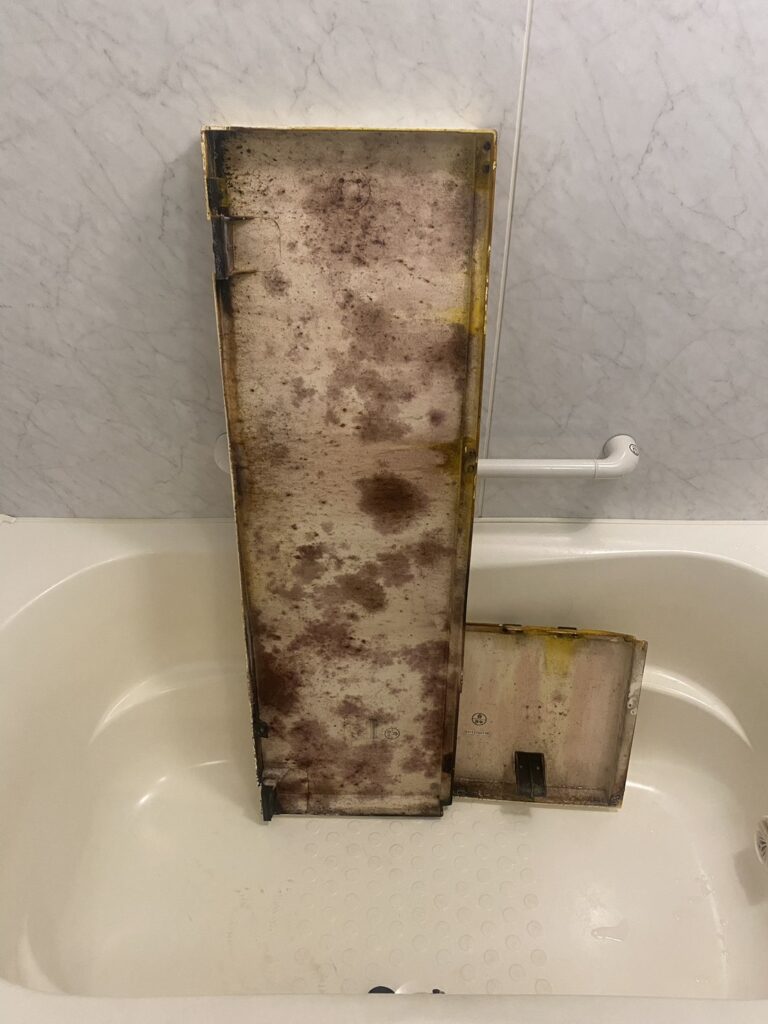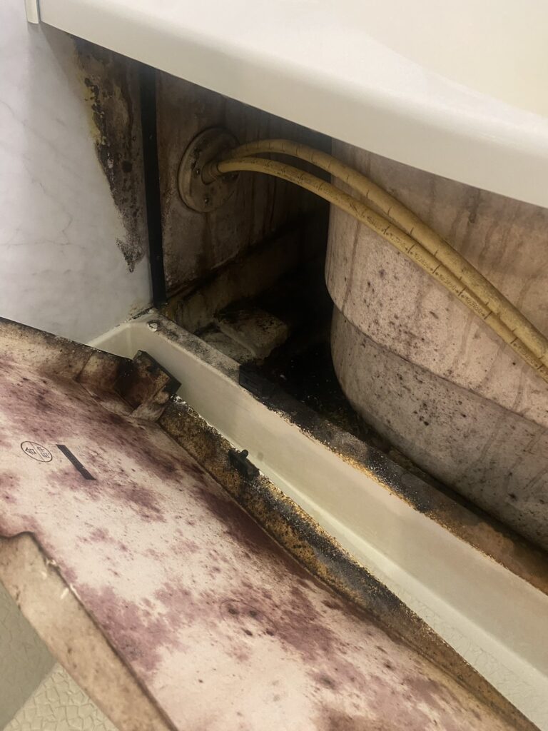 浴槽のエプロンを外した内部には、エプロン部分にまで頑固なカビや汚れが付着しているのが写真からもわかります。