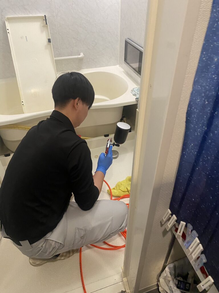 まずは浴槽のエプロンを取り外し、普段は見えない内部の清掃からスタート。