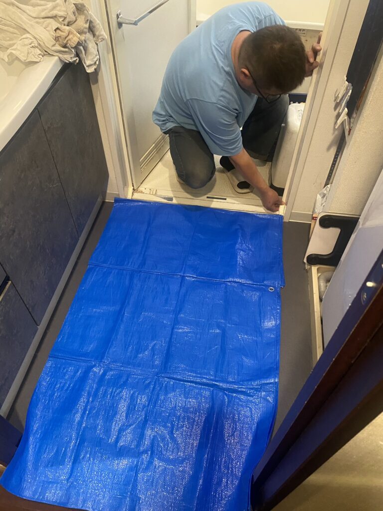 カビや水垢を落とすために強い洗剤を使用するため、作業前には周囲を汚さないようしっかりと養生を行います。