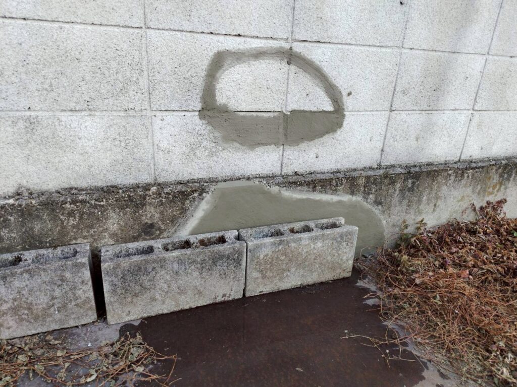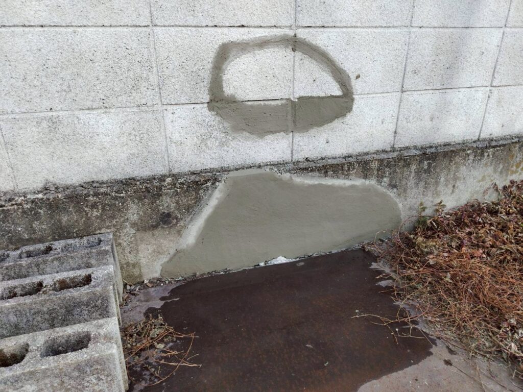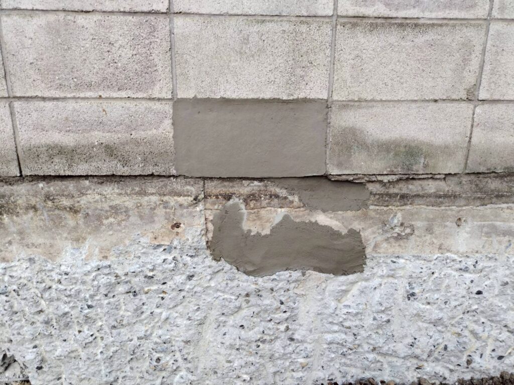 破損部分はブロックの欠損とひび割れが見られたため、下地を整えたうえで左官にて丁寧に補修を行いました。